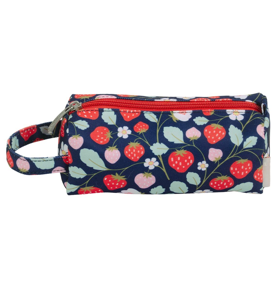 Tmavě modré pouzdro na pastelky, fixy nebo psací potřeby s veselým potiskem jahod je vyrobené z udržitelného polyesteru. Je ideální na cesty, na nošení do školy nebo na kroužky. Pouzdro se zapíná na zip, je podšité a má pohodlnou rukojeť. Tento skvělý penál udrží všechna vaše pera a tužky bezpečně na jednom místě.