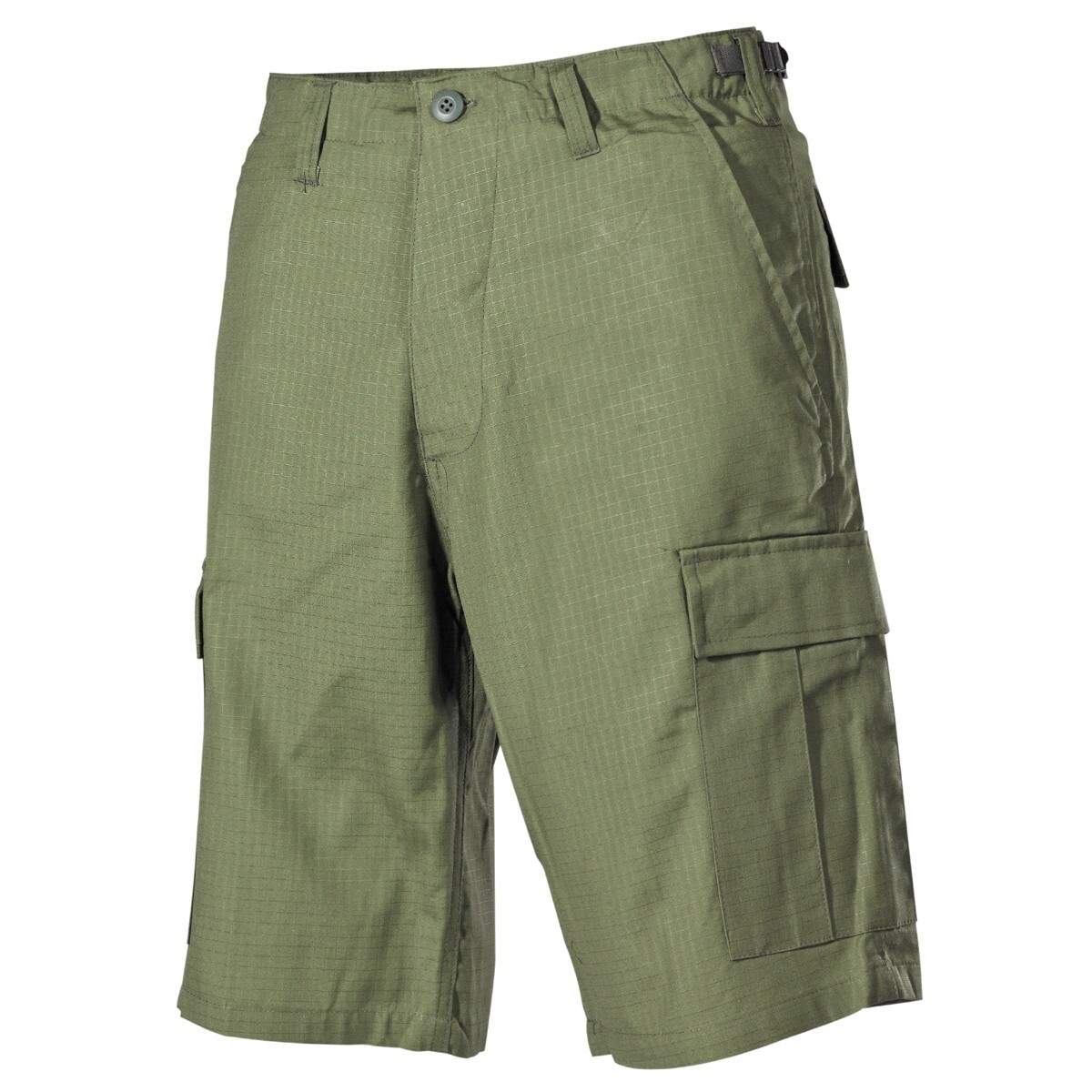 Kraťasy klasického střihu BDU v Rip-Stop úpravě jsou vhodné do parných dnů. Lehký odolný materiál proti roztržení. Mají 2 boční stehenní velké vakové kapsy kryté klopou, 2 zadní kapsy s klopu a 2 přední kapsy na ruce. Šířku pasu lze doopravit pomocí stahovacích pásků na bocích. Zapínání je na na knoflíky.