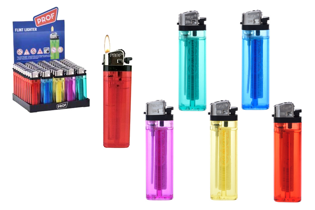 Zapalovač značky PROF s kvalitním křesadlem a plynovou náplní. Tento jednorázový zapalovač (nelze opakovaně naplnit) umožňuje regulaci intenzity plamene. Díky průhlednému tělu je k dispozici v pěti různých barvách.