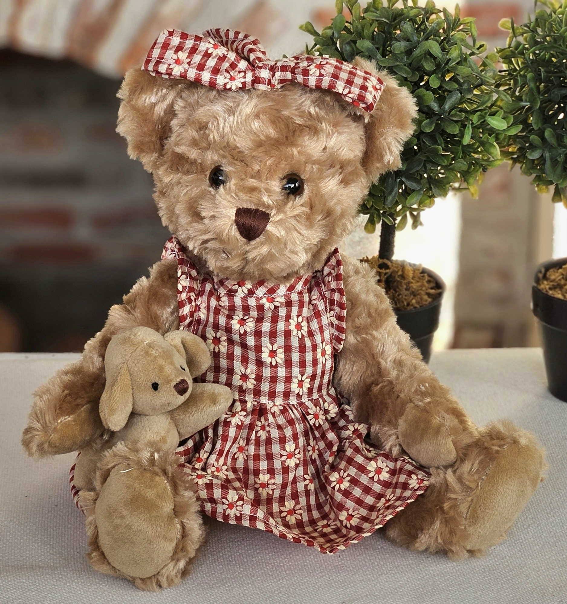 Plyšový medvěd v růžových šatičkách s pejskem