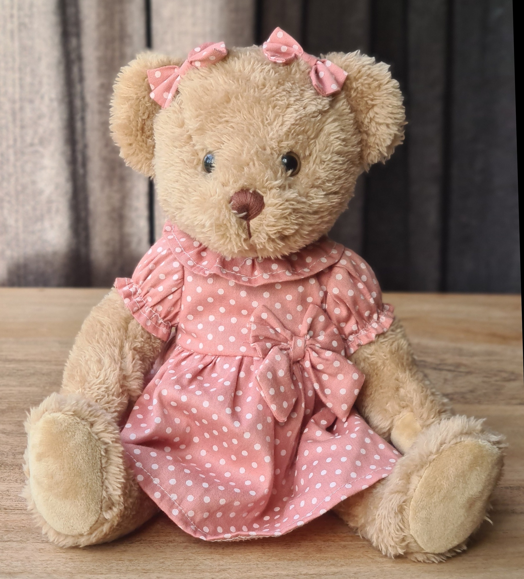 Plyšový medvěd v růžových šatech s puntíky je součástí kolekce belgické značky La Galleria prečítať celé
