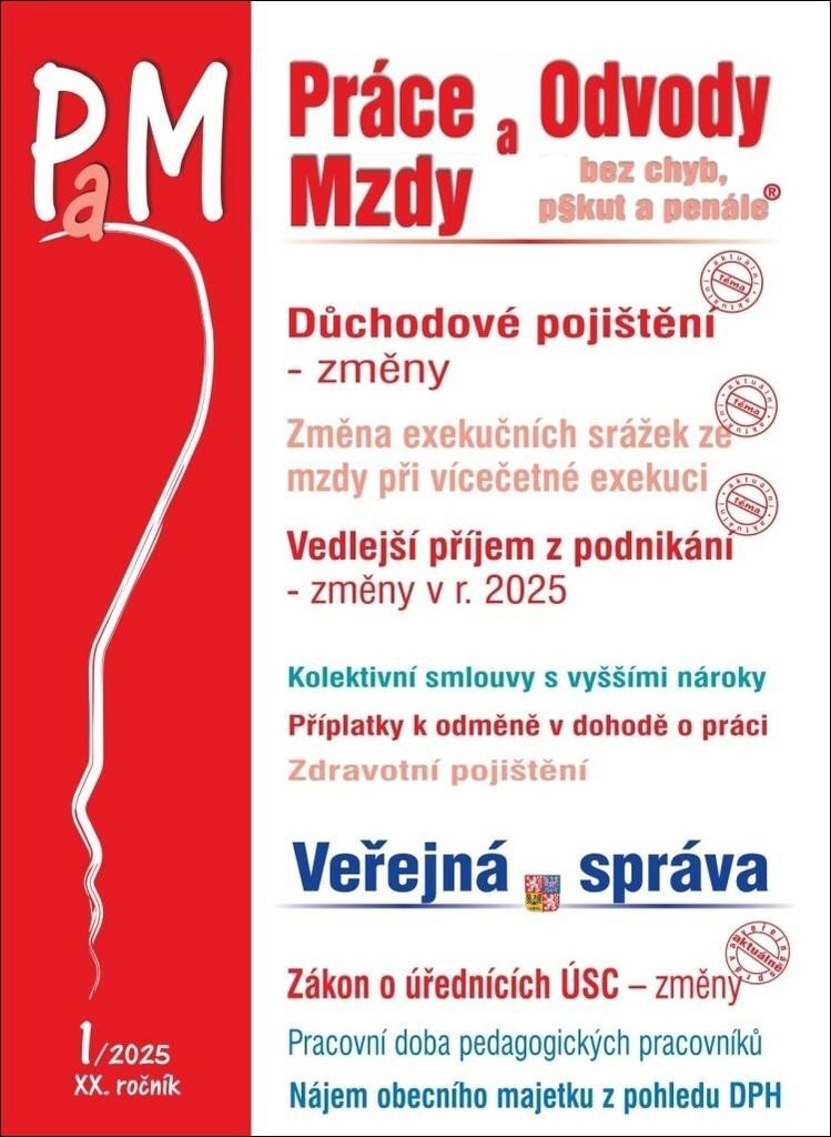 Změny v důchodovém pojištění - Ve Sbírce zákonů byly publikovány tři nařízení vlády, týkající se zvýšení důchodů v roce 2025. Výše základní výměry důchodu se stanoví s účinností od 1. ledna každého kalendářního roku ve výši 10 % průměrné mzdy, a to po zaokrouhlení na celé desetikoruny nahoru. Vzhledem k tomu, že průměrná mzda pro rok 2025 činí 46 557 Kč, byla stanovena podle pravidel základní výměru důchodu pro rok 2025 ve výši 4 660 Kč.