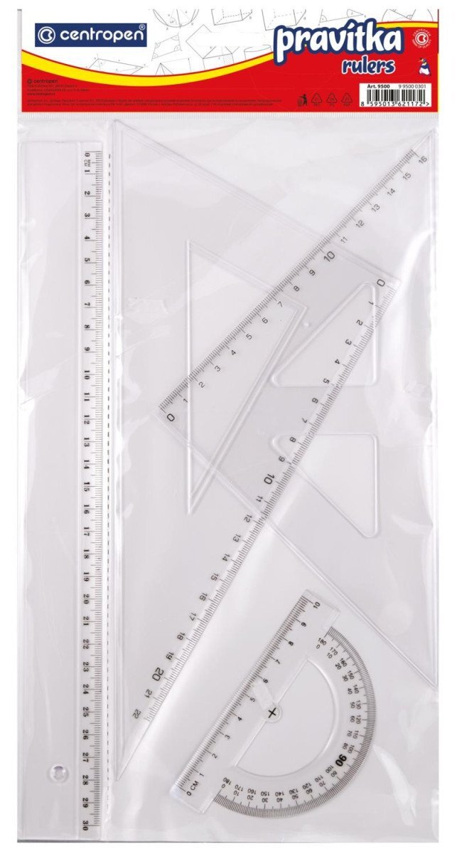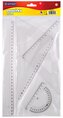 Táto praktická sada obsahuje všetko, čo potrebujete pre precíznu prácu s čiarami a uhlami. Súčasťou sú dva kvalitné trojuholníky - jeden s ryskou 45°/177 mm a druhý s ryskou 60°/250 mm, univerzálny uholomer 180°/100 mm s ryskou pre jednoduché odčítanie uhlov a pravítko dlhé 30 cm. Všetko je vyrobené z priehľadného plastu, čo uľahčuje presné zacielenie a prácu s detailnými náčrtmi, bez toho aby vám čokoľvek prekážalo.