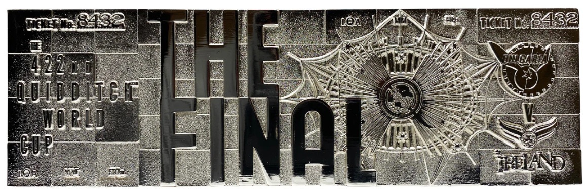 Postříbřená kovová replika vstupenky na finále mistrovství světa ve famfrpálu mezi Bulharskem a Irskem, které se dějově odehrávalo ve čtvrtém díle Harry Potter a Ohnivý pohár.