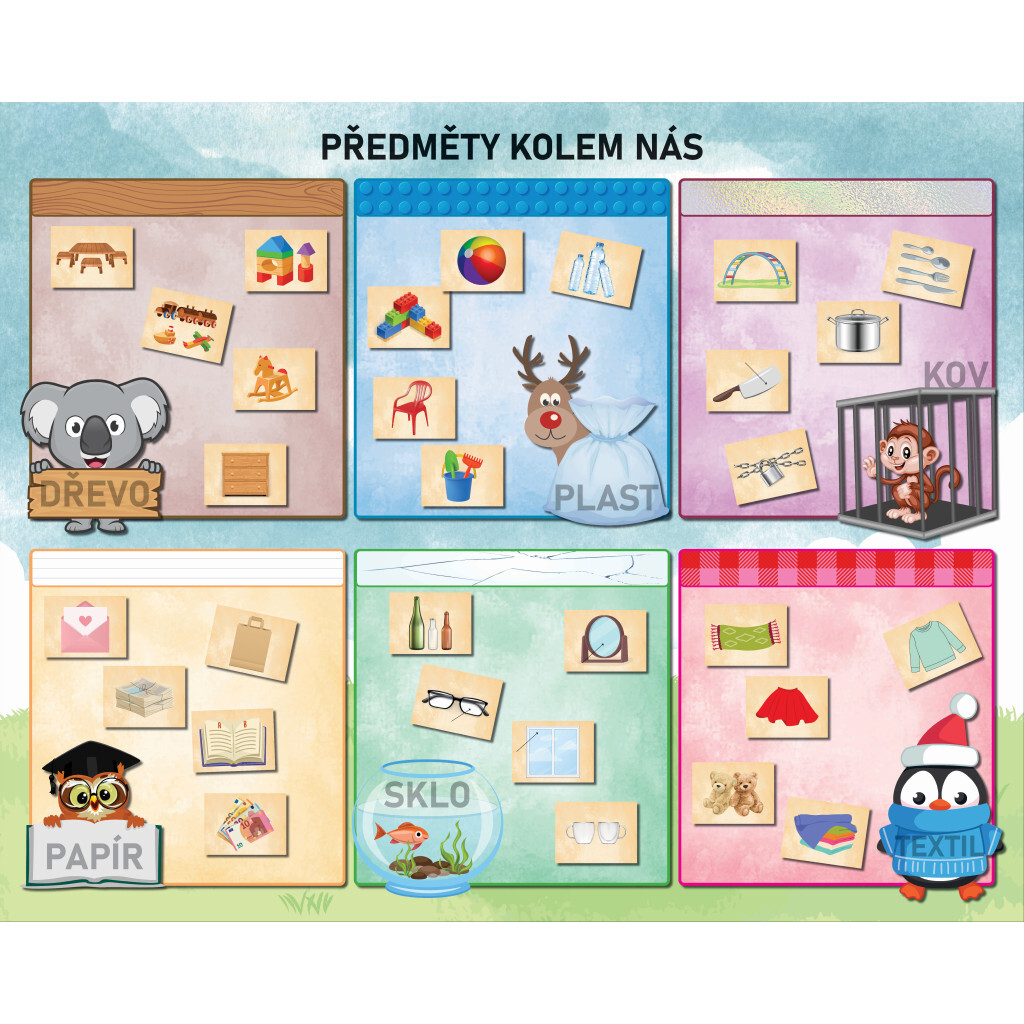 Vzdělávací set se závěsným naučným magnetickým obrazem a kartami seznamuje děti s jednotlivými předměty, které se běžně používají. Správným přiřazováním karet na odpovídající místo se děti učí rozlišovat mezi jednotlivými předměty, seznámí se s různými druhy materiálů, ze kterých jsou...