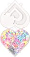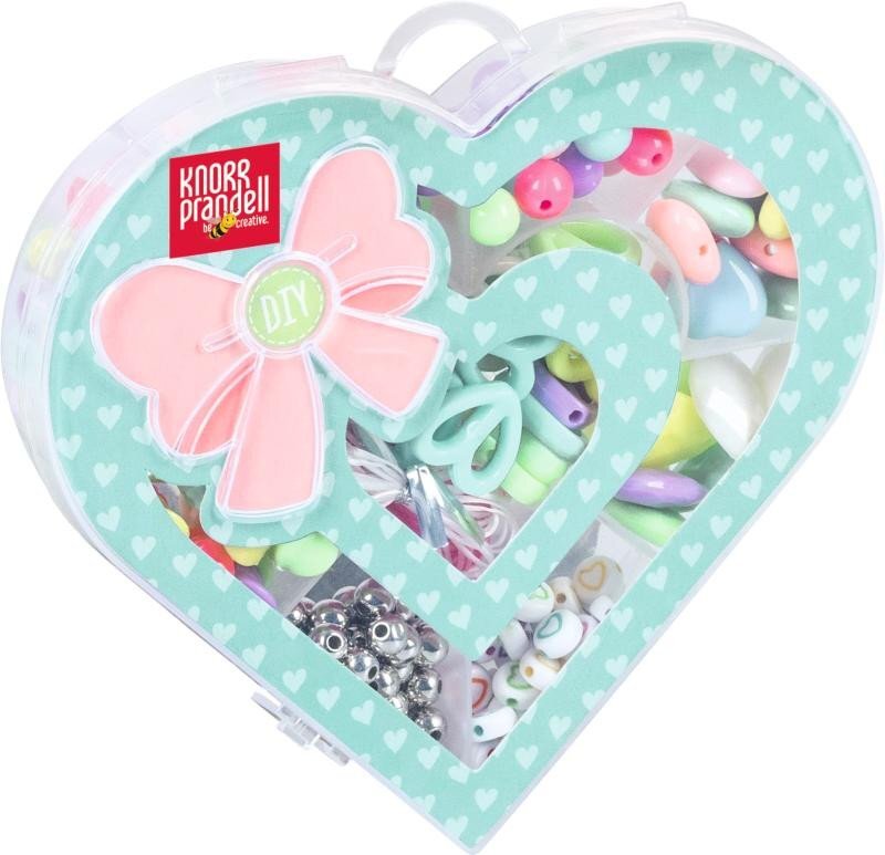 Set pro navrhování náhrdelníků a náramků. Balení obsahuje plastové korálky v různých barvách a provedeních, bílou a růžovou elastická nit a opakovaně uzavíratelnou krabičku. Perly barevně sladěné průhledné a neprůhledné. Vhodné pro děti od 4 let. Velikost balení 125×115×20 mm, 42 gramů.