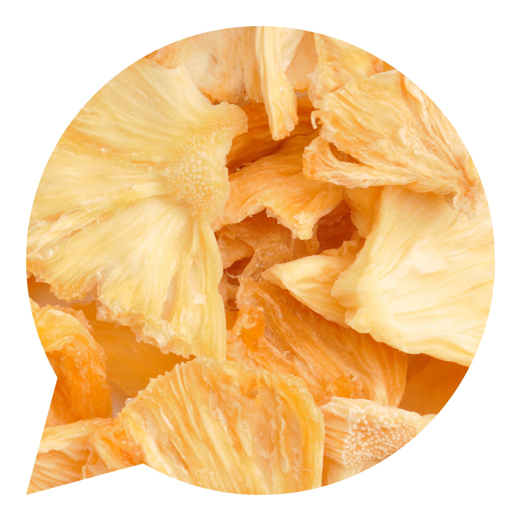 Sušený ananas kousky. produkt kontrolovaného ekologického zemědělstvíKalorická hodnota/energie (na 100ml):1330kJ/314kcal. Tuky:0,9g. z toho nasycené mastné kyseliny:0,1g. Sacharidy:71,0g. z toho cukry:71,0g. Vláknina:5,7g. Bílkoviny:2,6g. Sůl:0,03g prečítať celé
