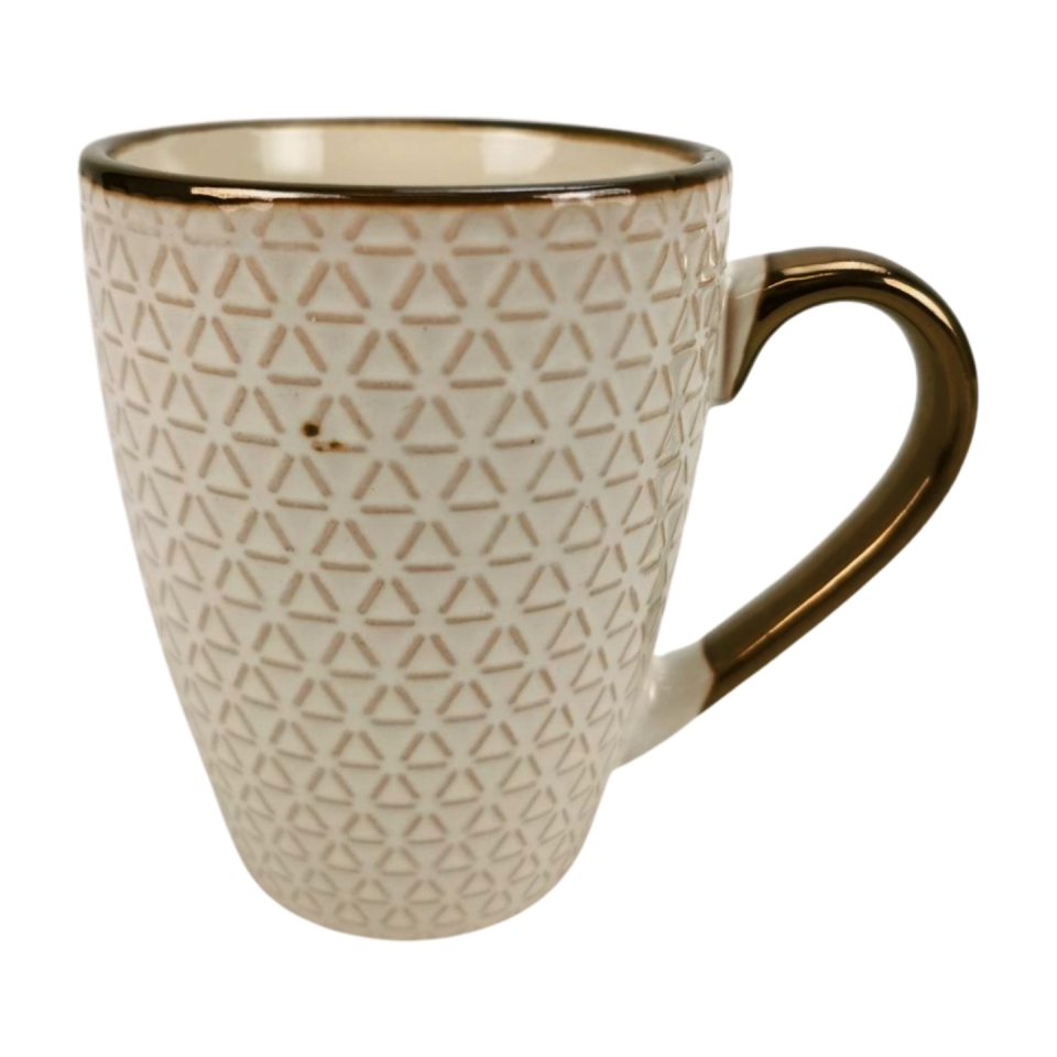 Krásný kameninový hrnek s bílou glazurou a metalickým okrajem.Materiál: kameninaRozměry:hrnek 12,5x8,7x11 cmobjem hrníčku 370 mlhmotnost 338gjakost - nerovnosti a barevné nedokonalosti v glazuře prečítať celé