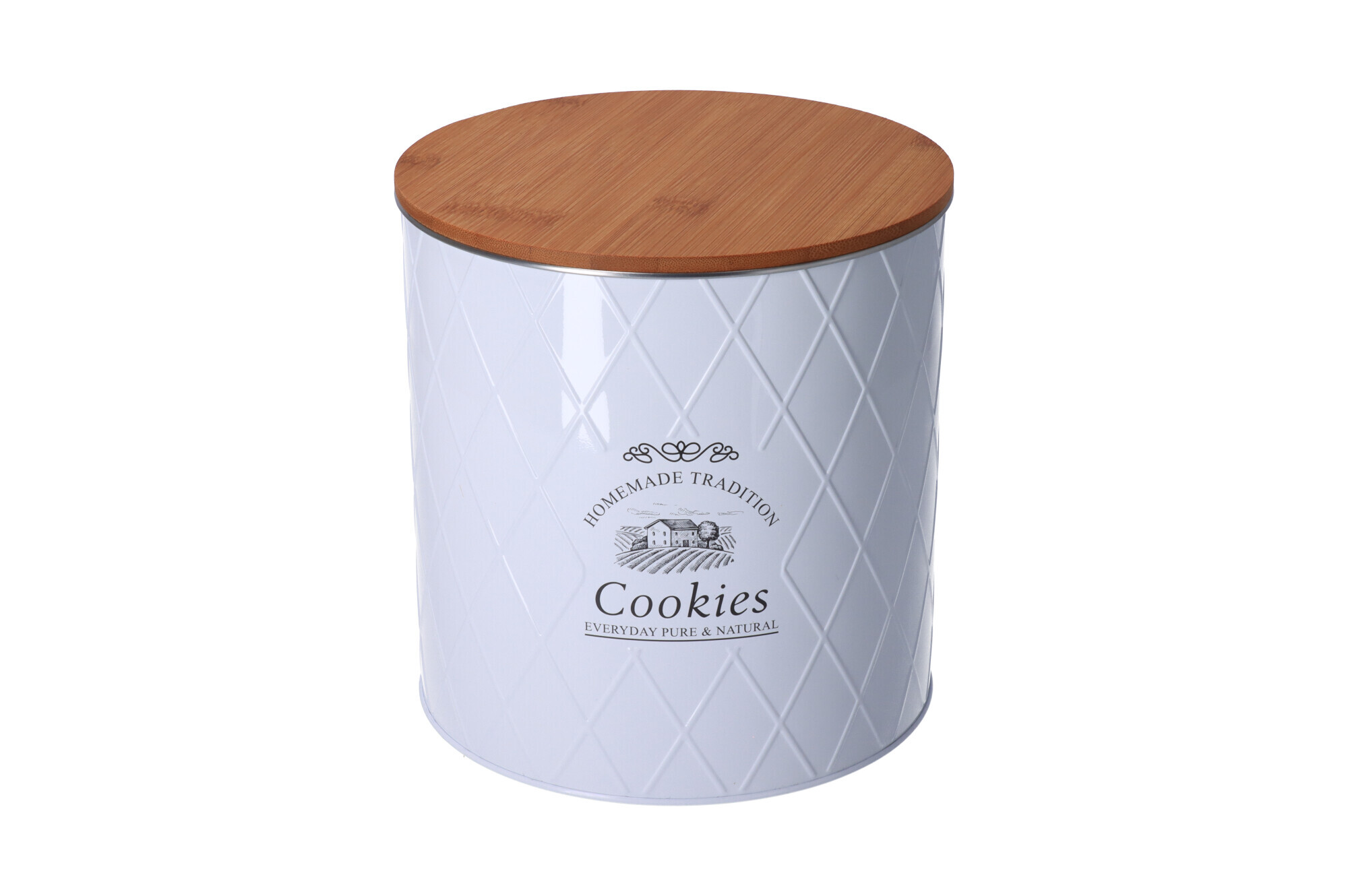 Praktická dóza na sušenky všeho druhu. Těsné bambusové víko izoluje křupavé dobroty od vlhkosti a vzduchu, díky čemuž zůstanou dlouho čerstvé. Víko je vyrobeno z bambusového dřeva, zatímco nádoba je z lakovaného kovu. Kombinace bílé barvy s charismatickou strukturou a dřevěným víkem vytváří elegantní dózu, která stylově zapadne do moderních i tradičních kuchyní.
