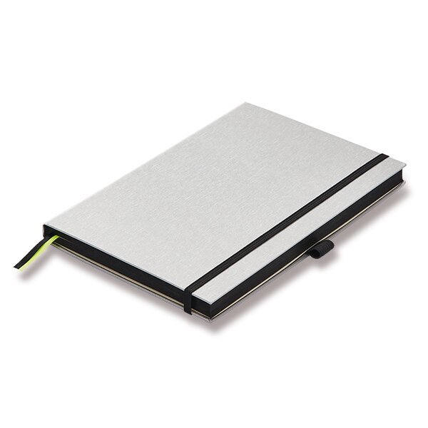 Zápisník v kovové barvě s metalickým efektem s pevnou, ve hřbetu šitou vazbou v kartonových deskách, obepnutý pružnou páskou proti samovolnému otevírání. prečítať celé