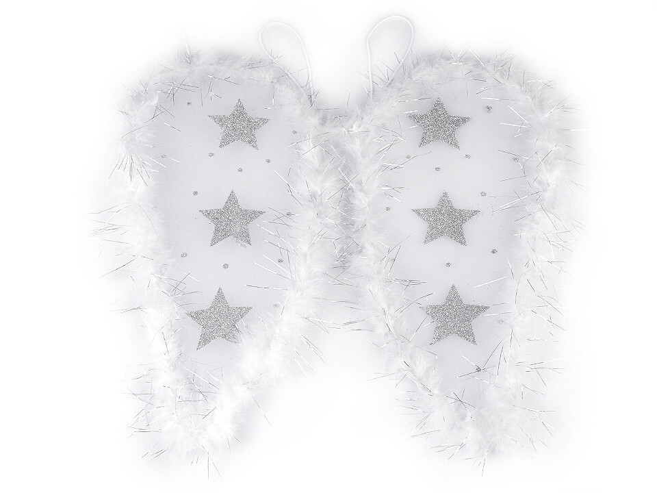 Andělská křídla jsou nejdůležitější součástí andělského kostýmu. Připevňují se pomocí dvou gumiček, které se navléknou na ramena. Pevná drátěná konstrukce je po obvodu ozdobená lemem z peří a lurexovými vlákny. Na křídlech jsou glitrové hvězdy a puntíky, jenž křídlům propůjčují nadpozemský třpyt....