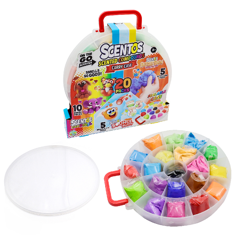 - zestaw zawiera 20 zapachowych mas plastycznych: 10 kulek ciastoliny, 5 kulek odbijającej się masy i piasek kinetyczny w 5 kolorach; całość zapakowana w praktyczną walizkę;