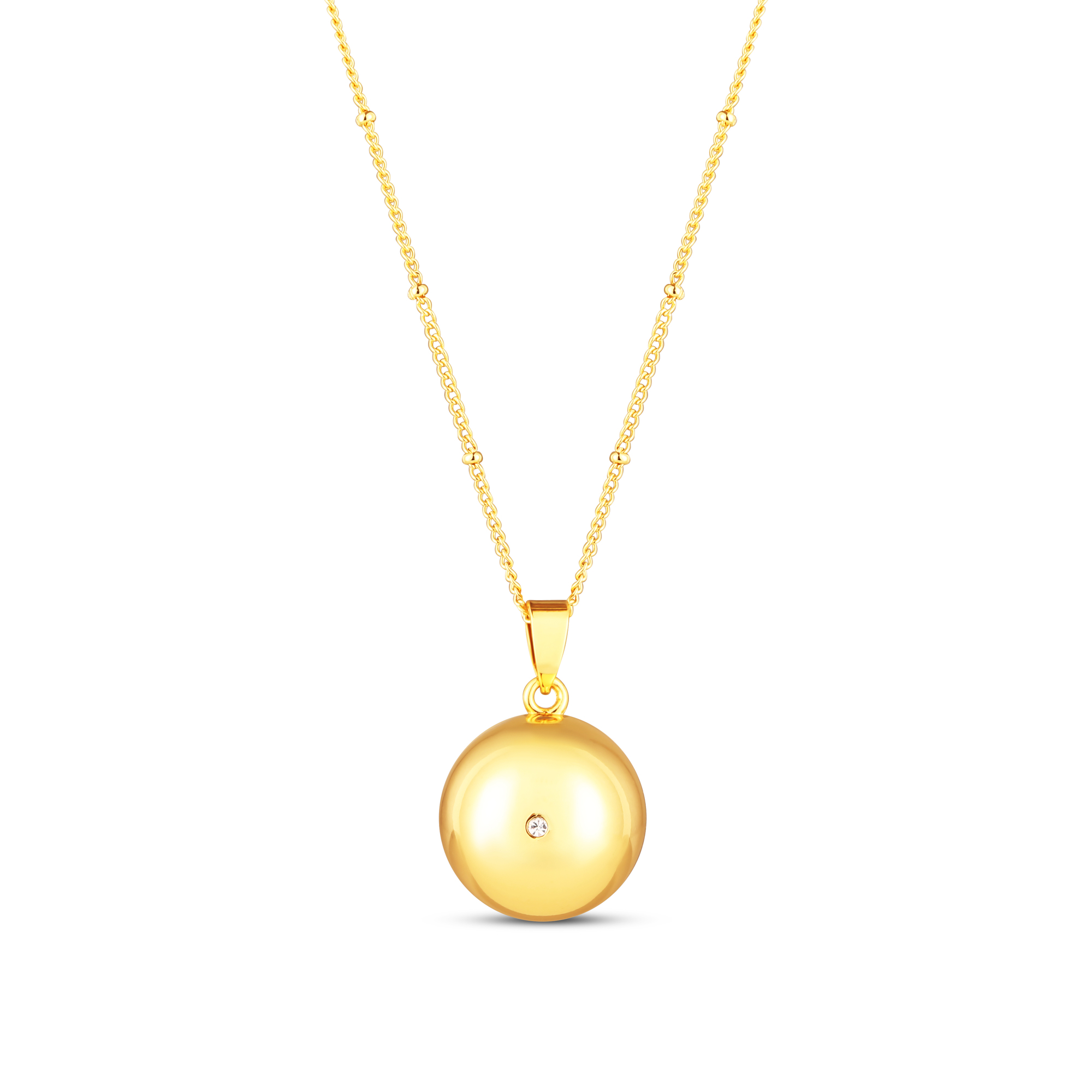 Těhotenská bola Moniel Glow s bílým kamínkem a řetízkem bude je dokonalým šperkem a vzpomínkou na období těhotenství. Rolnička má uklidňující zvuk, který si miminko zapamatuje a poskytne mu uklidňující pocit bezpečí i po narození. Bola je pozlacena 18 karátovým zlatem a ozdobena zirkonem. Součástí sady je bola, řetízek, dárková krabička, luxusní koženkové pouzdro na bolu a kartička s osobním vzkazem.