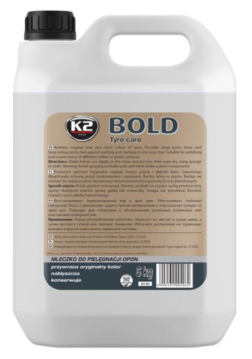 K2 Bold je rychlý a snadno použitelný prostředek pro lesk a údržbu pneumatik. Obnovuje původní vzhled, dodává lesk a sytou černou barvu. Chrání před UV zářením, praskáním a dehtováním. Hydrofobní vlastnosti snižují usazování nečistot. Lze použít i k lesku a údržbě jiných pryžových a plastových povrchů.