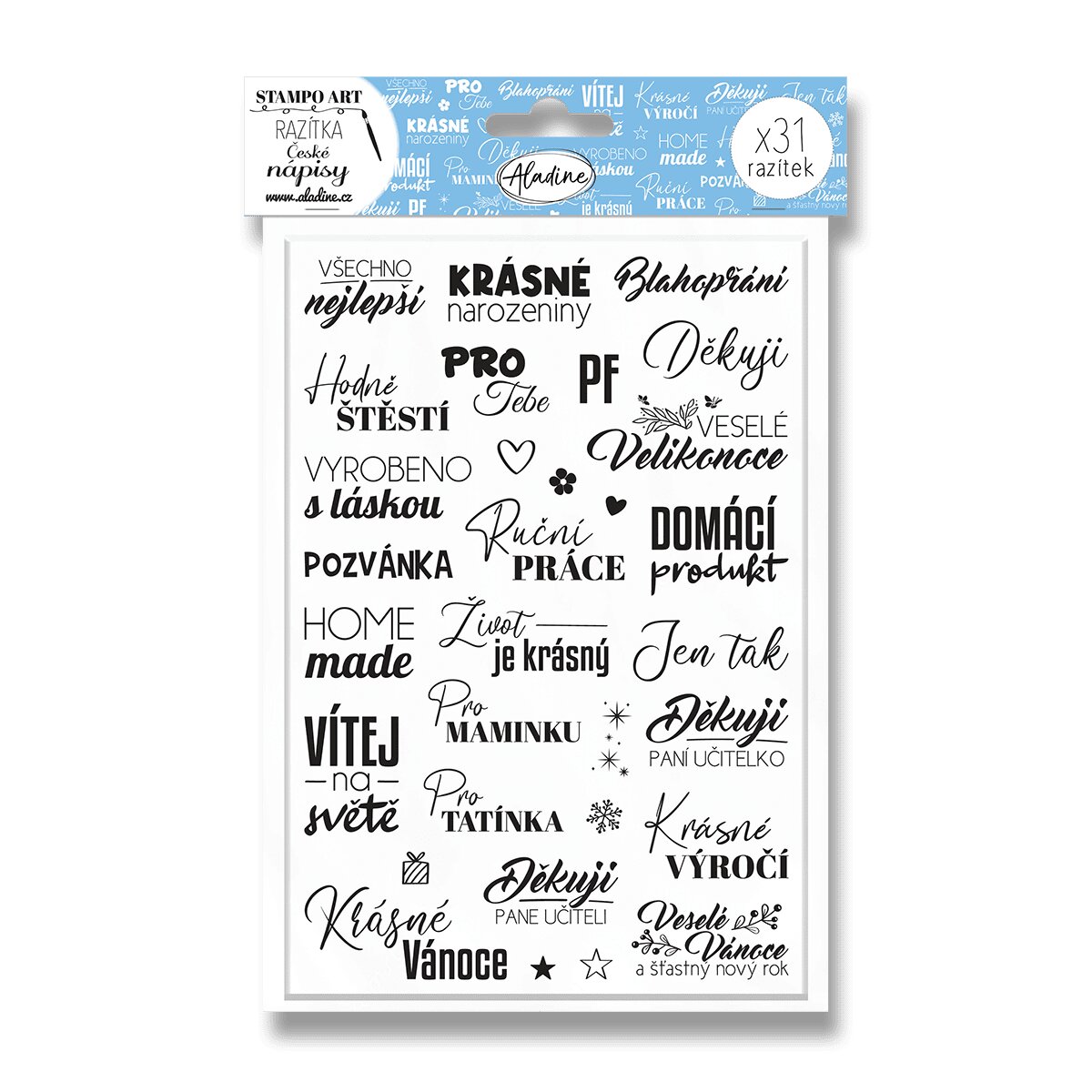 Originální gumová razítka s českými nápisy k výrobě drobností k narozeninám, svátkům, Vánocům a dalším speciálním příležitostem. Hodí se pro razítkování na papír k výrobě přání, obálek a visaček, ale jsou vhodné i na dřevo, látky a další povrchy. Vybraný nápis nebo drobný dekorativní obrázek stačí vyloupnout z pěnové desky a namočit do razítkovacího polštářku – doporučujeme rychleschnoucí razítkovací polštářky Aladine Izink Quick Dry.