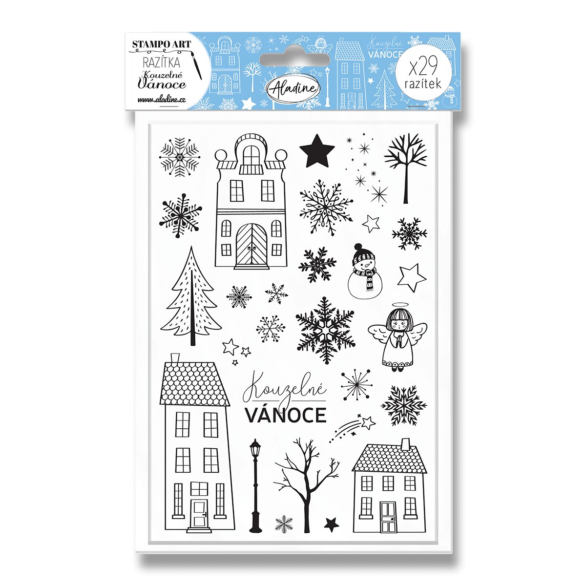 Originální gumová razítka s motivy domečků a sněhových vloček. Hodí se pro razítkování na papír k výrobě vánočních přání, obálek a visaček na dárky, ale jsou vhodné i na dřevo, látky a další povrchy. Vybrané razítko stačí vyloupnout z pěnové desky a namočit do razítkovacího polštářku – doporučujeme rychleschnoucí razítkovací polštářky Aladine Izink Quick Dry.