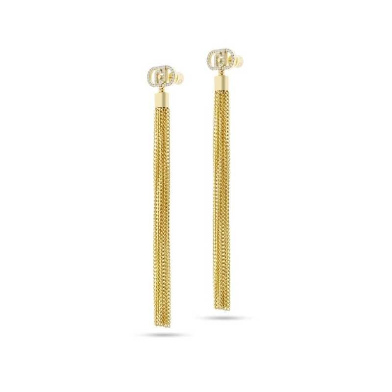 Elegantní fashion náušnice od značky Liu Jo jsou ideálním doplňkem pro každou ženu, která hledá styl a kvalitu. Vyrobeny z prvotřídní oceli a opatřeny zlatým PVD povlakem, tyto náušnice vynikají dlouhými řetízky a peckami ve tvaru loga značky, ozdobenými čirými krystaly. S délkou 9 cm a praktickým zapínáním na puzetku se stanou vaším oblíbeným módním kouskem, který doladí jakýkoliv outfit.