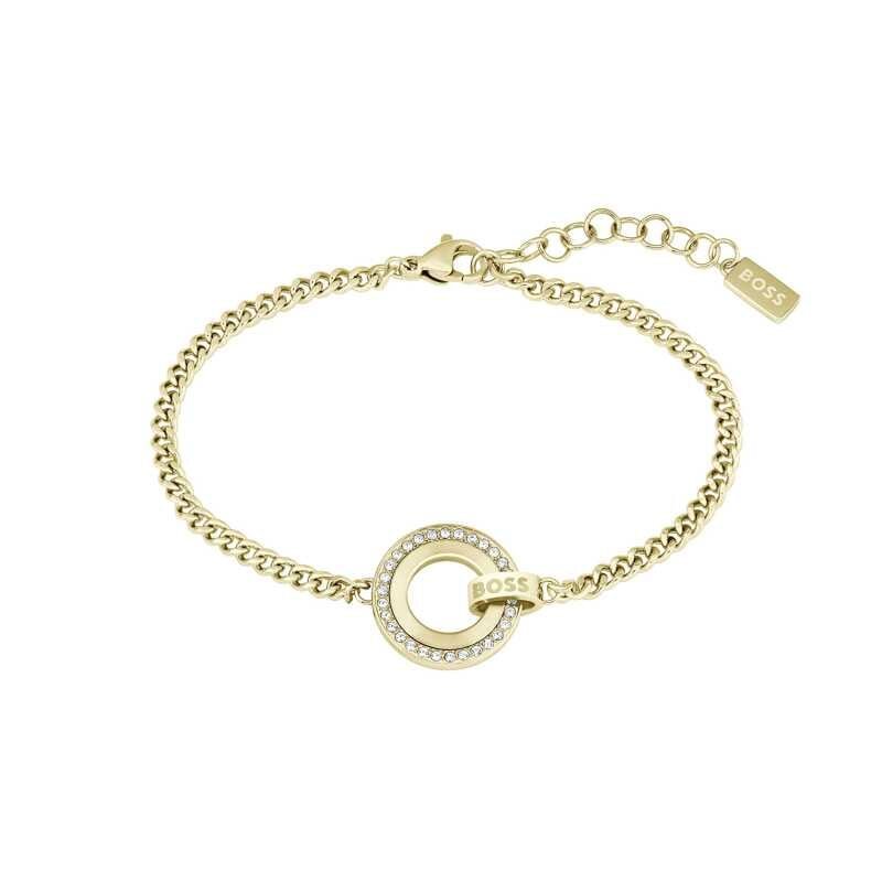 Dámský náramek značky Hugo Boss vyniká kombinací kvalitní oceli a elegantního zlatého PVD povrchu. Spojené kroužky, z nichž jeden je ozdoben čirými kamínky kubické zirkonie, přidávají šperku na jedinečnosti. Nápis značky zaručuje exkluzivní vzhled. S délkou 16 cm a možností prodloužení o 3 cm se... prečítať celé