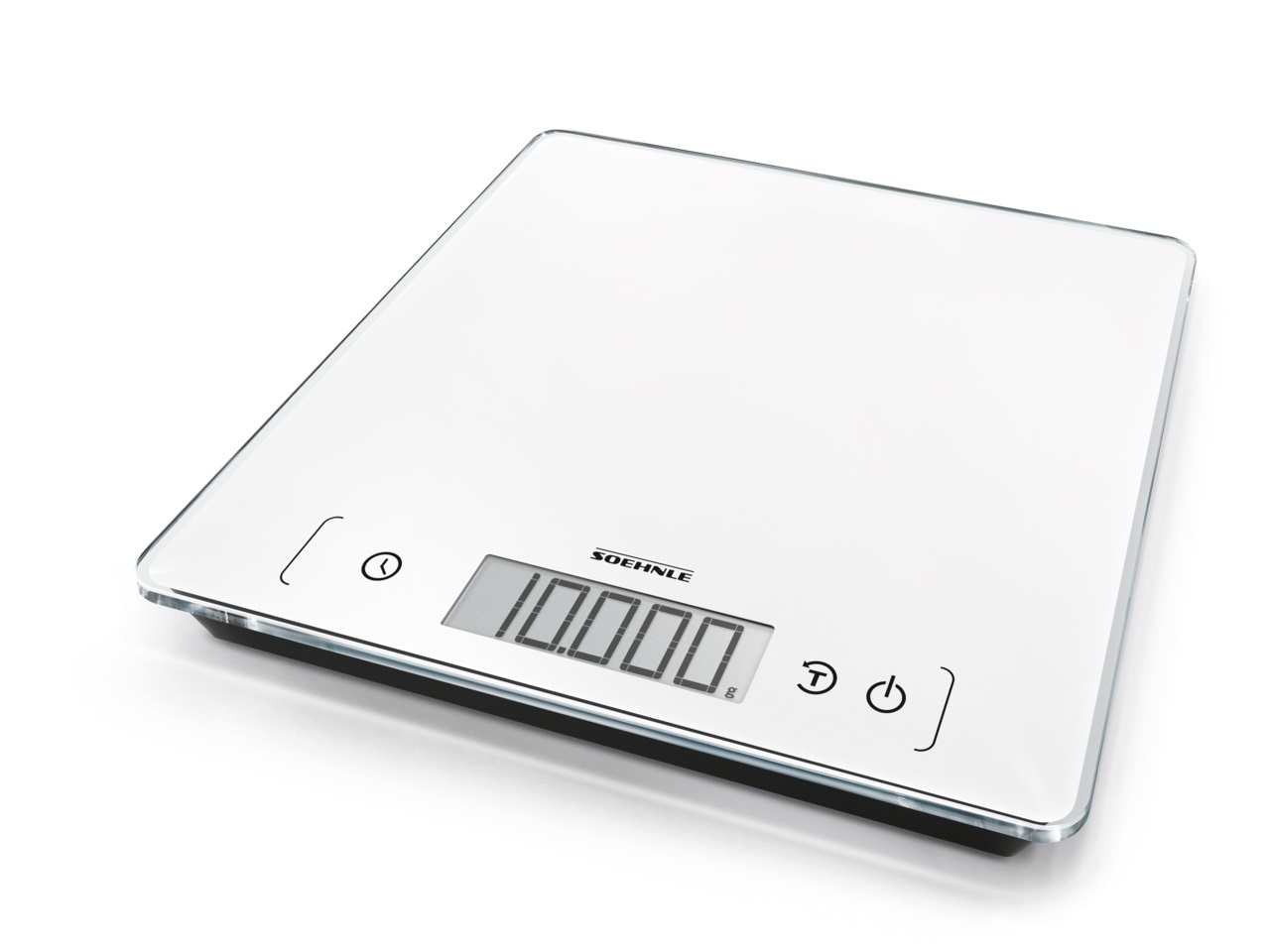 Digitální kuchyňská váha Page Comfort 400 se zobrazením hodin při nečinnosti značky Soehnle.