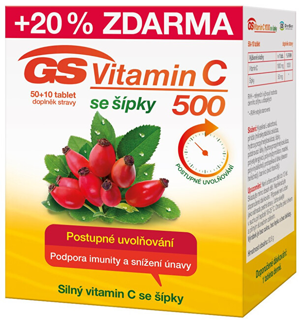 Přípravek GS Vitamin C 500 + šípky obsahuje vitamín C v dávce 500 mg s postupným uvolňováním, který přispívá k normální funkci imunitního systému. prečítať celé