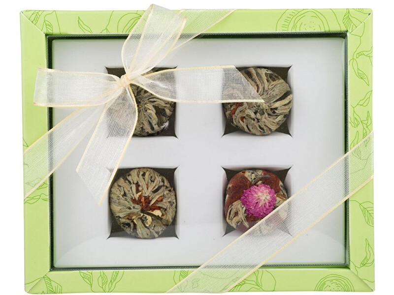 Dárkové balení pravých bílých kvetoucích ochucených čajů Bai He Xian Zi "Božská lilie", Man Tian Xian Tao "Posvátné květy", He Jia Huan Le "Rodinné štěstí", Xu Ri Dong Sheng "Vycházející slunce" v zeleném kartonovém obalu.