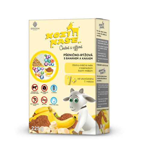 Kozí kaše pšenično-rýžová s banánem a kakaem je ideální pro zpestření a vylepšení jídelníčku malých dětí a kojenců od ukončeného 7. měsíce života díky kombinaci zdravého kozího mléka a ovoce s pšenično-rýžovou moukou. Kozí kaše svým složením plně odpovídají nejnovějším vědeckým poznatkům.