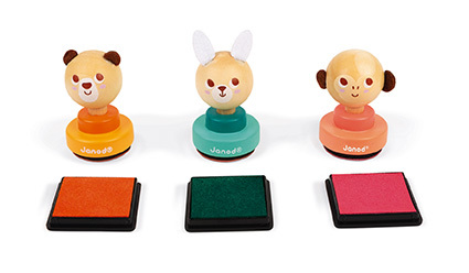 Displej obsahuje 24 ks razítek: 8 ks z každého zvířátka (medvídek, zajíček, opice). Děti se mohou bavit otiskováním hlavy zvířátka na papír. Každé zvířátko má razítko jiné barvy (zelený zajíček, růžová opice a oranžový medvídek). Uši zvířátek jsou vyrobeny z filcu. Prodávají se v displeji se zavěšeným štítkem na každém kusu. Dřevo zodpovědně získáno. Vhodné pro děti: od 3 let Rozměr produktu: průměr 3,5 x 6,8 cm Materiál: dřevo
