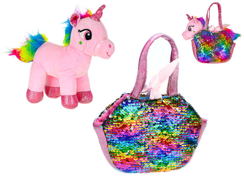 Jednorožec plyšový růžový 19cm s kabelkou s flitry 18x15cm