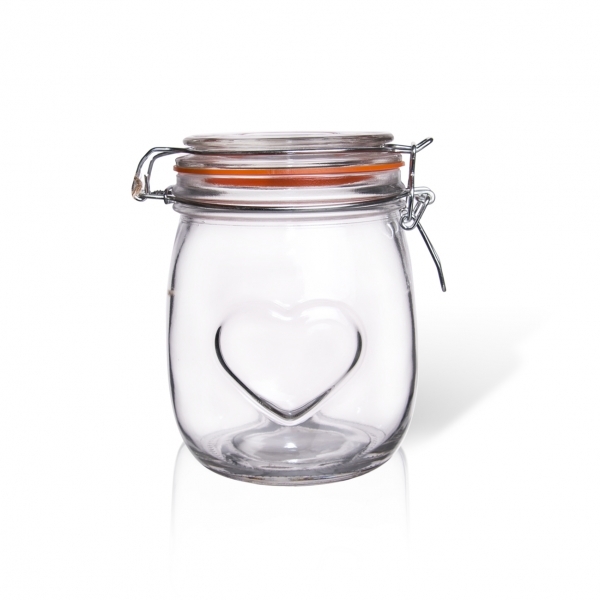 Dóza skleněná patentní s klasickým silikonovým těsněním a drátěným uzávěrem. Protlačený dekor srdce. Rozměry: objem 0,75 l, pr. 11 cm, v. 14 cm. Náhradní těsnění v naší nabídce 180516. Do myčky vhodné pouze sklo. Častým používáním myčky může docházet k šednutí skla. prečítať celé