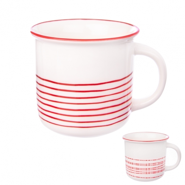 Krásný bílý hrneček o objemu 400 ml, který je vhodný do myčky a mikrovlnné trouby. Zdobí jej červená linka při okraji hrnku a nepravidelné červené proužky v jeho dolní polovině.  prečítať celé