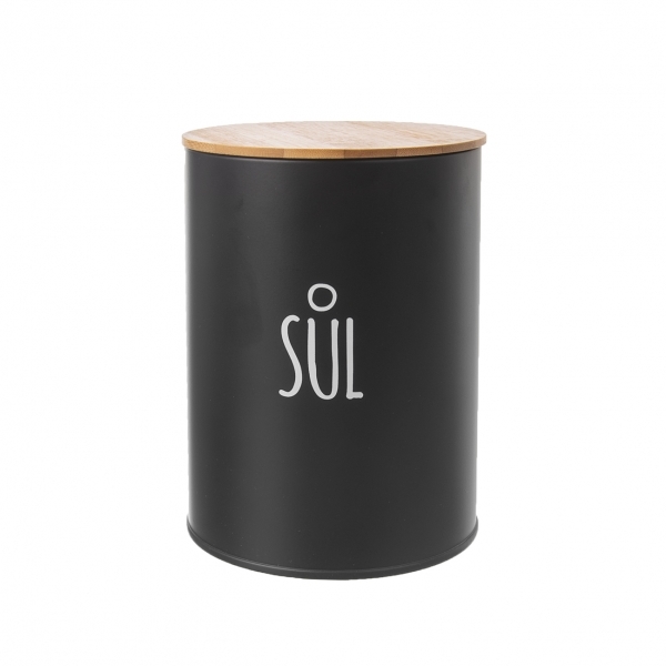 Dóza s víčkem na uložení soli. Materiál: plech, bambus, silikon - těsnění. Rozměry: o. 1,3 l, pr. 11 cm, v. 15,5 cm. prečítať celé