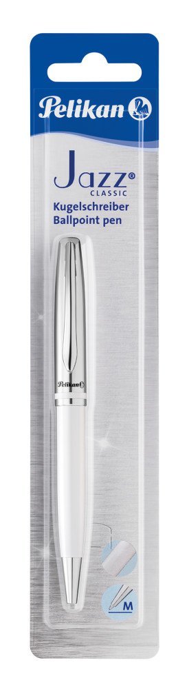 Jazz Classic, kovové s pochromovanou vrchní částí a perleťově bílou spodní částí těla, s kovovým klipem, leskle lakované, náplň Pelikan 337 M modrá, na blistru prečítať celé