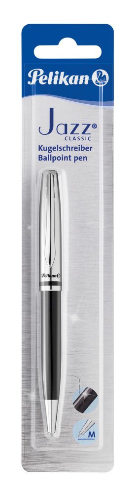 Jazz Classic, kovové s pochromovanou vrchní částí a černou spodní částí těla, s kovovým klipem, leskle lakované, náplň Pelikan 337 M modrá, na blistru prečítať celé