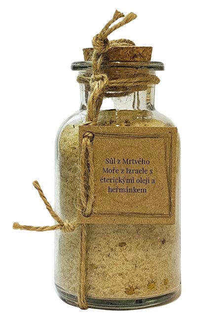 Sůl z Mrtvého moře z Izraele s heřmánkem 300 g je přírodní sůl z Mrtvého moře do koupele s příměsí heřmánku a éterickým olejem z mandarinky. Kombinace heřmánku a mandarinky má za následek, že heřmánek navodí atmosféru, kde se krásně uvolníte a můžete relaxovat a mandarinka vám dodá chybějící energii, díky její specifické vůni.