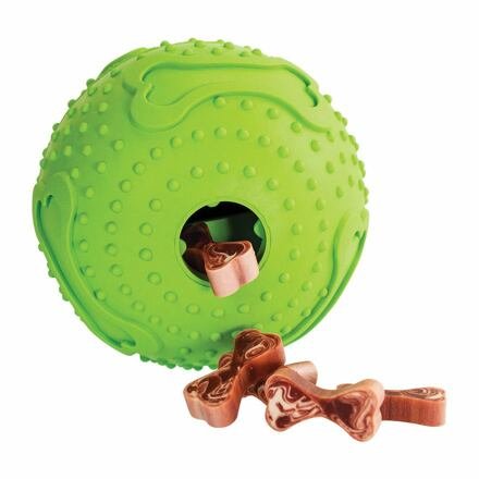 - uvnitř balonku jsou gumové přepážky, ve kterých se pamlsky zachytí, a když balon pes kutálí či ho kouše při hře, pamlsky vypadávají