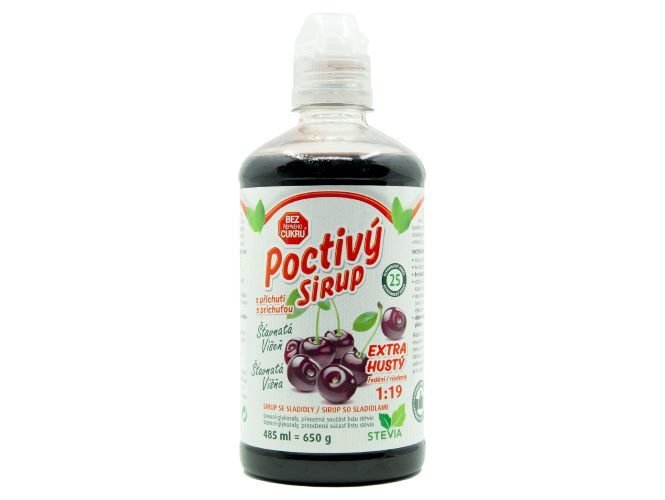 Sirup se sladidly z rostliny stévie - šťavnatá višeň je vyrobený ze sladidel ryze přírodního původu. Extra hustý a vydatný, ředí se v poměru 1:19. Chutná a voní jako šťávy od babičky. Bez bílého cukru, bez chemie a konzervantů. Nezvyšuje hladinu krevního cukru. Glykemický index pouze 25