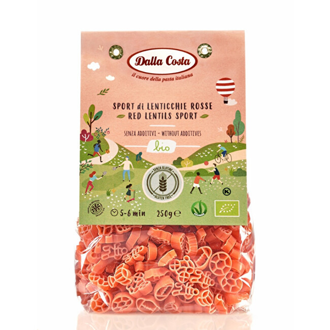 Bezlepkové těstoviny ve tvaru různých sportovních předmětů z červené čočky jsou speciálně určené pro děti. Italské těstoviny, které překvapí skvělou kvalitou i chutí z kontrolovaného zemědělství v BIO kvalitě. Obsahují organickou mouku z červené čočky, díky čemuž jsou bez lepku. Ve svých 100 g navíc ukrývají 26,5 g bílkovin. Jíst těstoviny bude děti bavit.