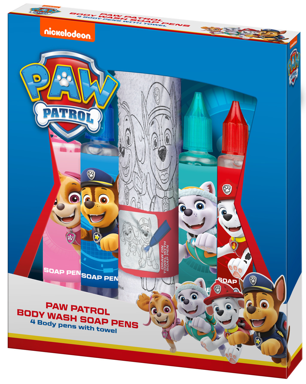 Sada mýdlových pastelek na tělo do vany (ve čtyřech barvách modrá, zelená, červená a růžová). S mýdlovými pastelkami Tlapková patrolaí se stává koupání zábavným zážitkem a vana se změnila v malířské studio. Děti si mohou pastelkami pokreslit celé tělo a pak jednoduše umýt vodou.Součástí balení je také malý ručník s obrázky hrdinů Tlapková patrola. Dermatologicky testováno, vyhovuje přísným normám EU. Zdravotně nezávadné.