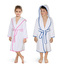 Župan je vyrobený z velice kvalitního froté materiálu ze 100% bavlny. Je dobře savý, hřejivý a vhodný i pro citlivou pokožku. Župan je zavinovací a stahuje se v pase pomocí pásku. Má kapucu , nemá kapsy,je opatřen poutkem na zavěšení. Délka županu 80 cm , délka rukávu 41 cm , obvod přes prsa 82 cm