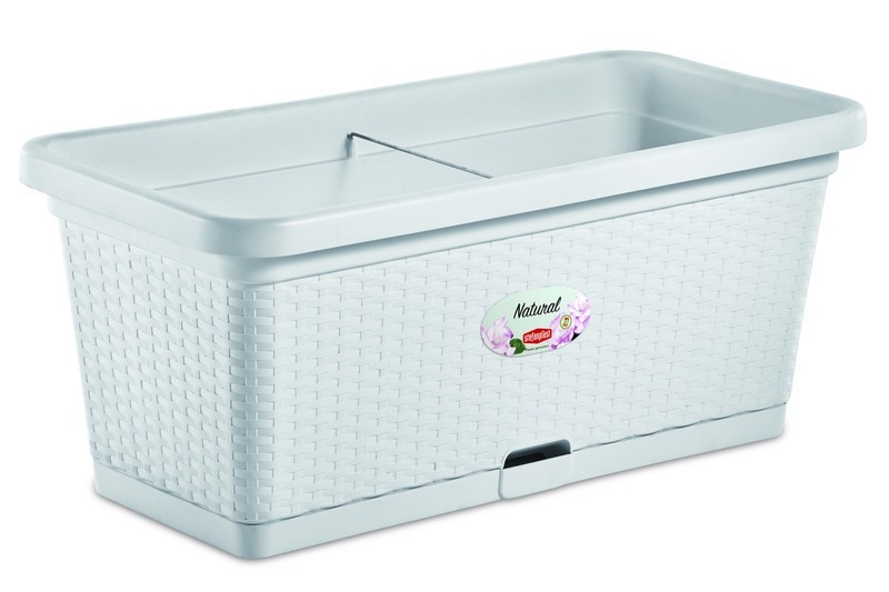 samozavlažovací truhlík imitace ratanu v bílé barvě rozměry 80 x 40 x výška 34 cm na kolečkách objem truhlíku je 66 litrů, objem zásobníku vody je 2,7 litru uvnitř truhlíku je kovová spona, zajišťující stálý tvar po naplnění prečítať celé