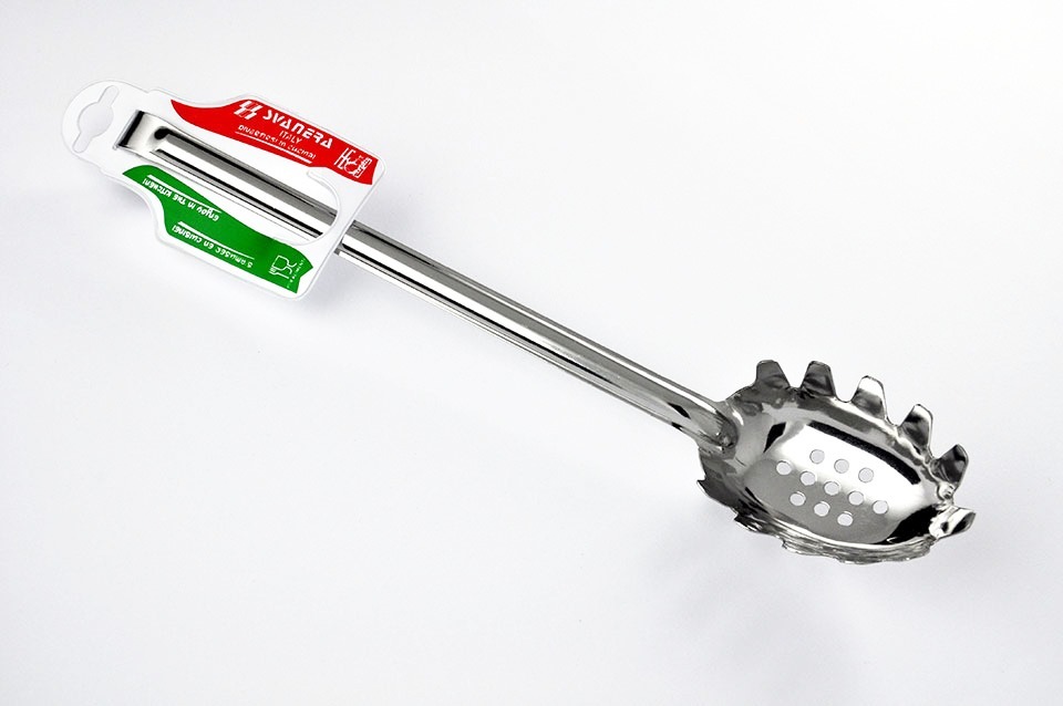 kvalitní celonerezová naběračka na špagety se závěsným háčkem, délka 34,5 cm, šířka 6,5 cm, vhodná do myčky nádobí italský výrobce EAN 8005498087863 prečítať celé