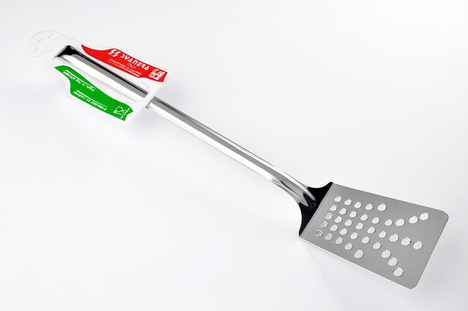 kvalitní celonerezová děrovaná obracečka s háčkem na zavěšení, délka 36,5 cm, šířka 7 cm, vhodná do myčky nádobí italský výrobce EAN 8005498087801 prečítať celé