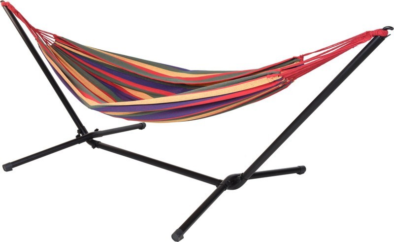 HAMMOCK WITH METAL STAND, HAMMOCK SIZE: 200X150CM MULTI COLOUR 320GR/M2 POLY/COTTON (65/35 PERCENT) WITH SEWING LABEL, FRAME SIZE 290X118X93CM WITH 2 FOOT RESTS 118CM TUBE DIA 42X2MM AND DIA 40X1,2MM MAX CARRY WEIGHT 120 KG. NEW STAND 2018/ 1.190X190X140MM, Brown box/colour label / CFT 1,16,(1.900/40ft HQ)