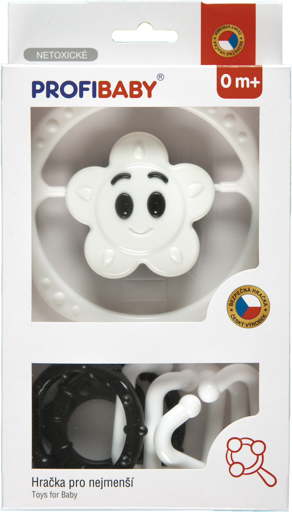 Souprava chrastítko řetěz + chrastítko hvězdička/kytička černobílá. Stimuluje smysly sluchu, zraku i hmatu dítěte a zároveň se cvičí uchopovací reflex. Chrastítka splňují náročné hygienické normy, jsou bez ostrých hran a bez uvolnitelných malých částí. 2 varianty - hvězda, kytička.