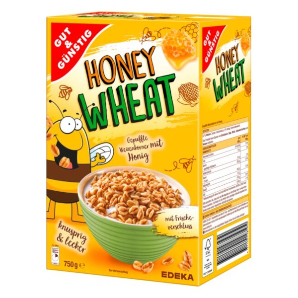 GG Honey Wheat pšeničné lupínky s medem 750gKřupavé a chutné cereálie ve tvaru pšeničných zrn slazené medem. Zejména s čerstvým mlékem jsou neodolatelné a perfektně se tak hodí pro rychlou přípravu snídaně či svačiny.Praktické balení - uzavíratelný sáček - cereálie vydrží déle čerstvé.