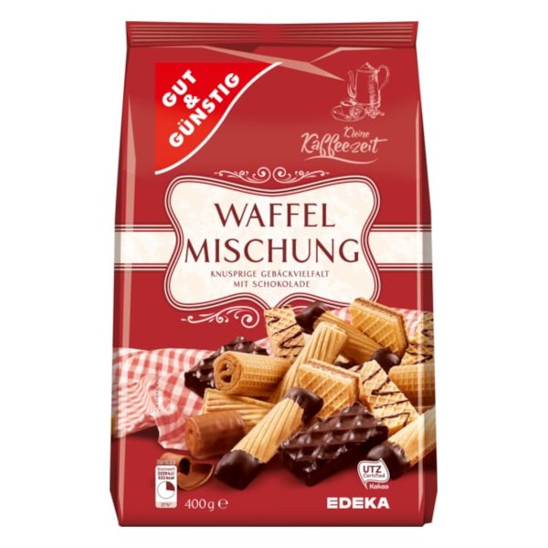 GG Směs oplatek s hořkou čokoládou - různé tvary - 400gVynikající směs německých vaflových sušenek zdobené hořkou čokoládou. Ideální ke kávě nebo čaji. Bez umělých aromat, barviv a hydrogenovaných tuků. Použité kakao je z udržitelného pěstování - Certifikace UTZ.  prečítať celé