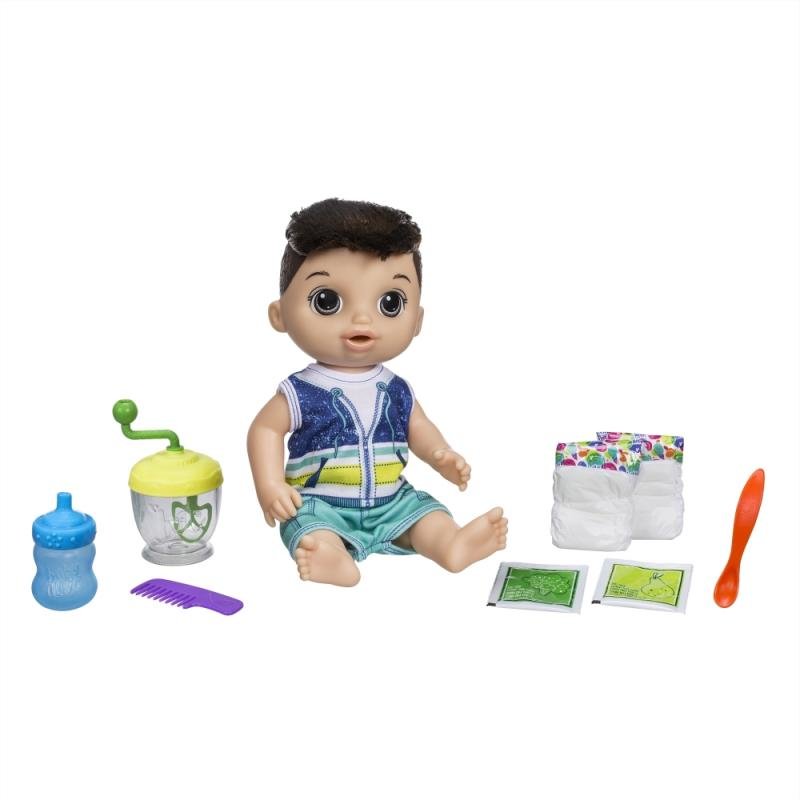 Tmavovlasý chlapec s mixérem nabízí dětem nový zábavný způsob, jak se postarat o svou panenku. Chlapeček pije vodu a jí pro něj speciálně připravené jídlo. Stačí v mixéru (součástí balení) smíchat brokolicový či hruškový prášek s vodou a ihned je na světě skvělé jídlo pro vašeho chlapečka. Stačí...