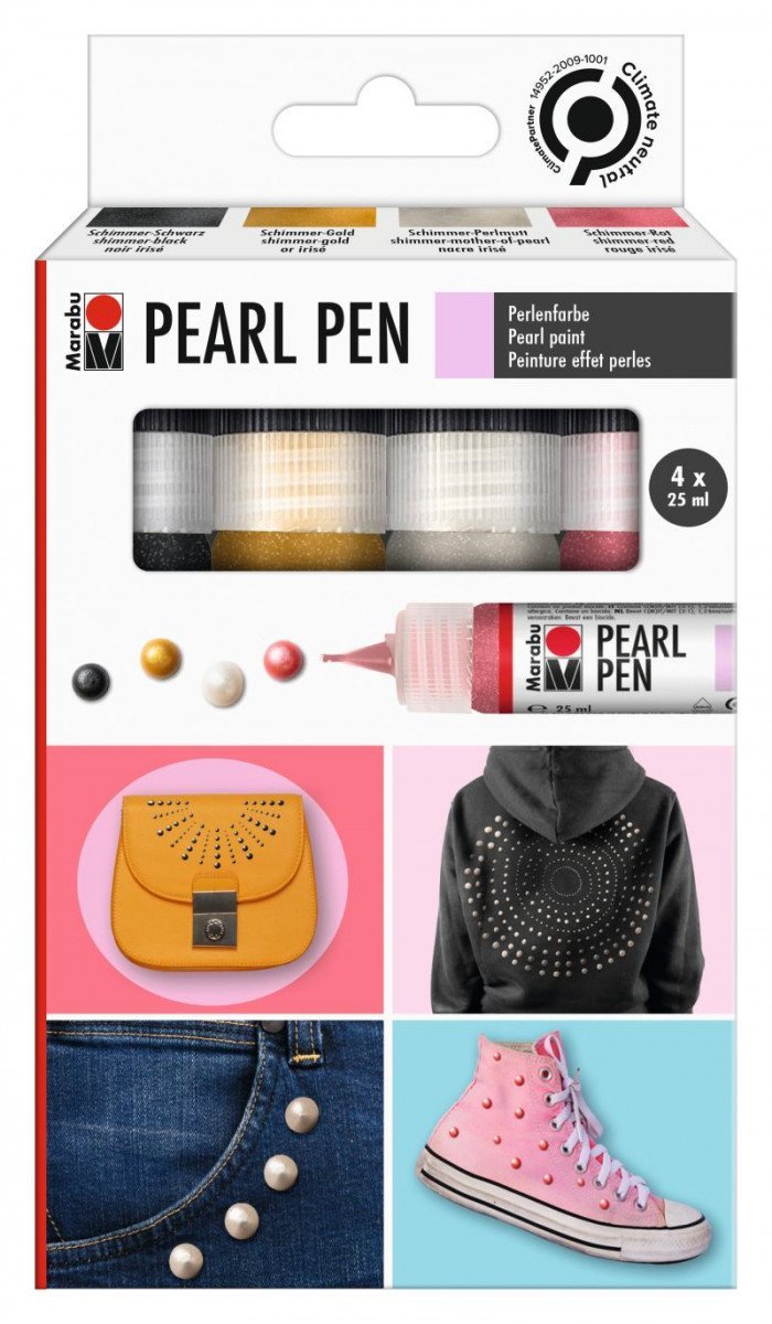 Sada 4 x Pearl Pen 25 ml (531 třpytivě červená, 572 třpytivě perleťová, 574 třpytivě černá, 583 třpytivě zlatá) Marabu PEARL PEN je perleťová barva na vodní bázi,po zaschnutí je její povrch leskle/třpytivý. Vytváří vyvýšené půlperly, jejichž velikost je daná množstvím nanesené barvy.Barva PEARL...
