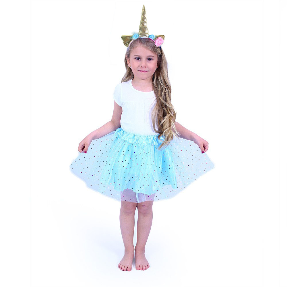 Roztomilá sukýnka TUTU nesmí žádné holčičce v šatníku chybět! Sukénka je určena pro holčičky ve věkovém rozmezí 3-10 let (104-146 cm), obvod pasu 48-80 cm. Tento úchvatný modrý kousek je zdoben oslnivými flitry. Součástí této sady je senzační čelenka jednorožce s duhovým rohem a ušima! Staň se hvězdou karnevalového večírku díky této sukýnce!