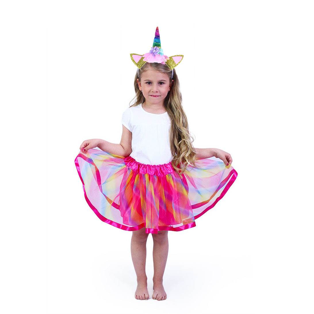 Roztomilá sukýnka TUTU nesmí žádné holčičce v šatníku chybět! Sukénka je určena pro holčičky ve věkovém rozmezí 3-10 let (104-146 cm), obvod pasu 48-80 cm. Tento úchvatný kousek v duhových barvách je zdoben saténovým lemováním. Součástí této sady je senzační čelenka jednorožce se zlatým rohem a barevnými růžemi! Staň se hvězdou karnevalového večírku díky této sukýnce!
